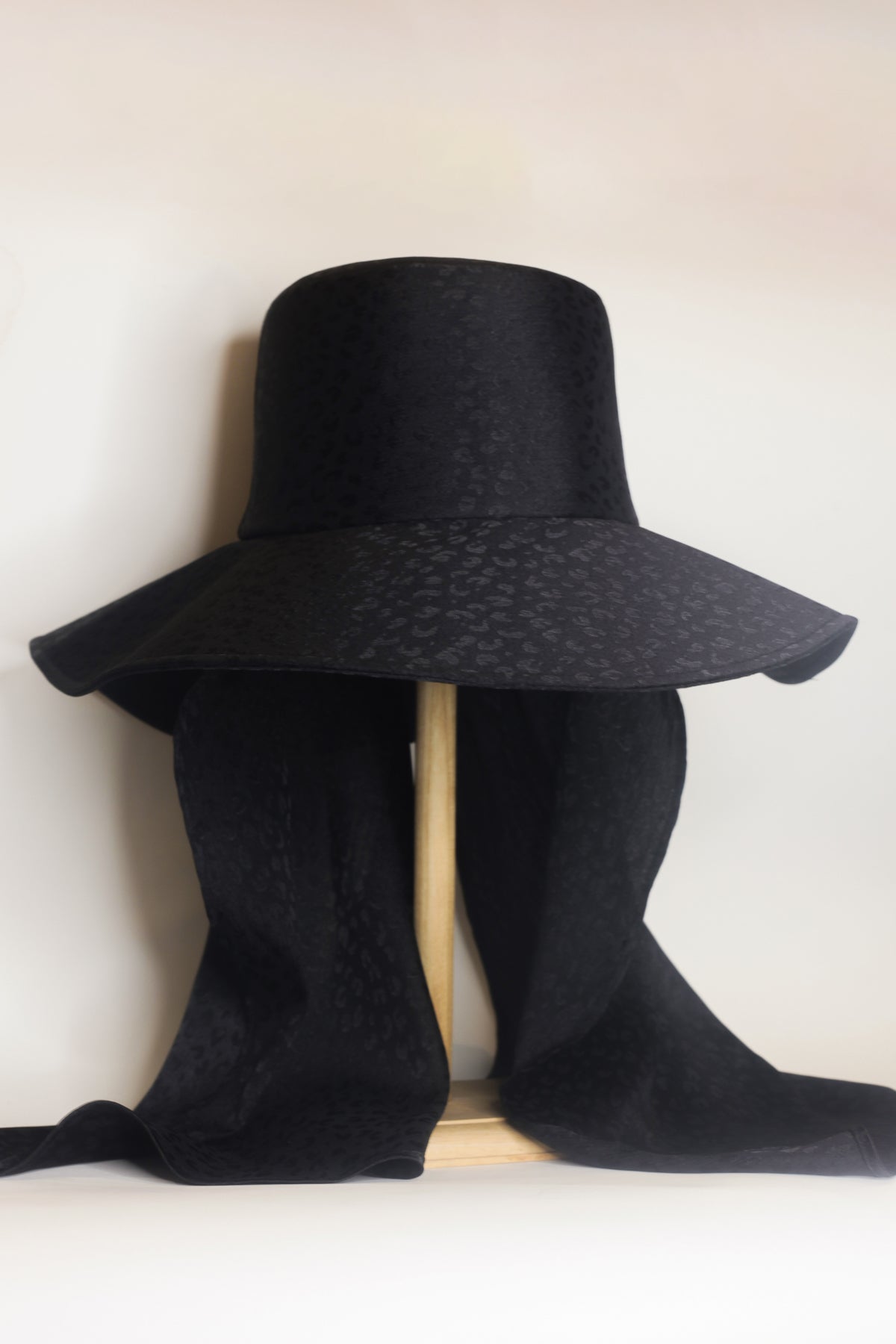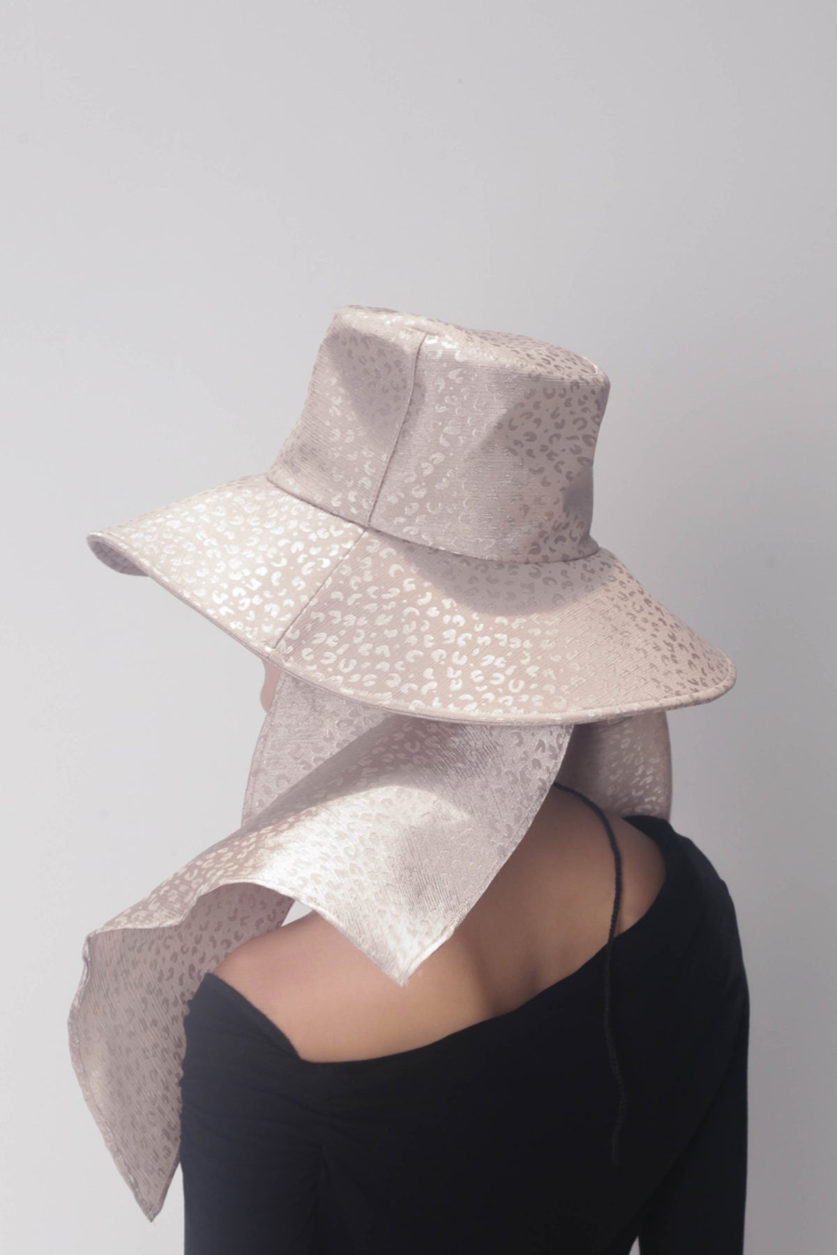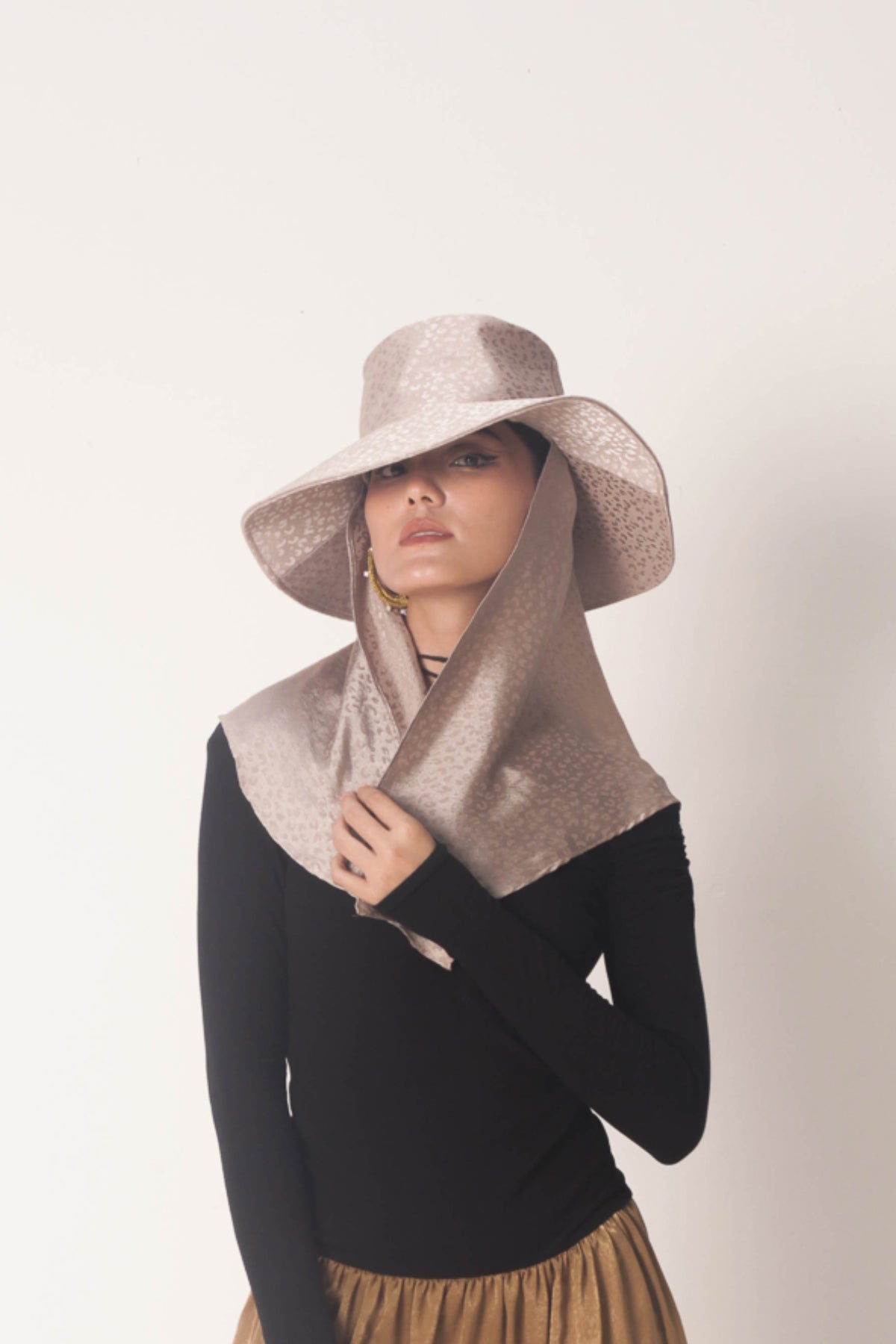 Jess silk scarf hat channels the secrets of the desert and wild endeavours. The opulent silk with leopard print catches the light with a subtle sheen. At the back, the silk leopard print scarf is reminiscent of windblown dunes and adds an air of intrigue.