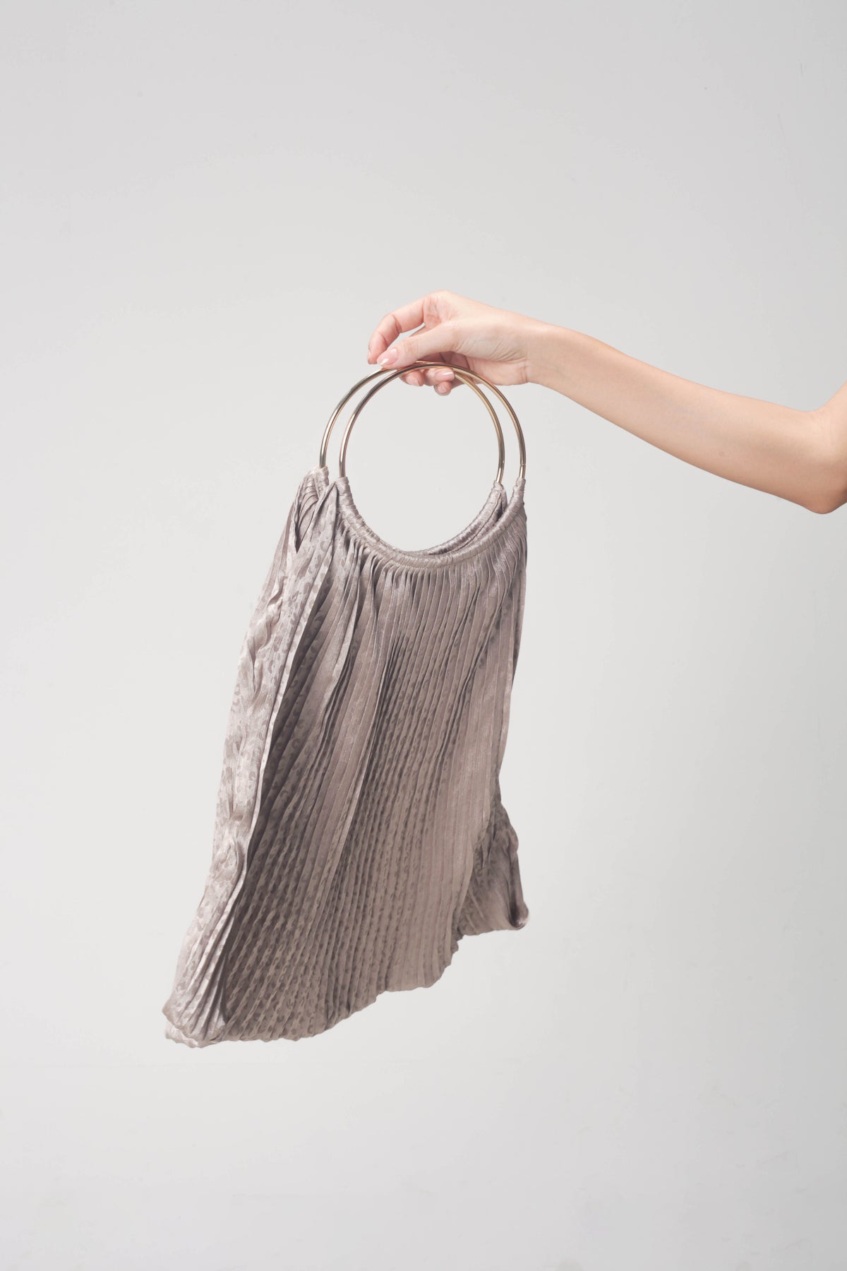 Mala bag is crafted from silk with a mesmerizing shimmer leopard print, with pleats hinting at the windblown curves of sand dunes. The metal round handle is a bold contrast to the fluid silhouette, channeling an eastern mystique. Take yours to a day at the beach or a soiree.
