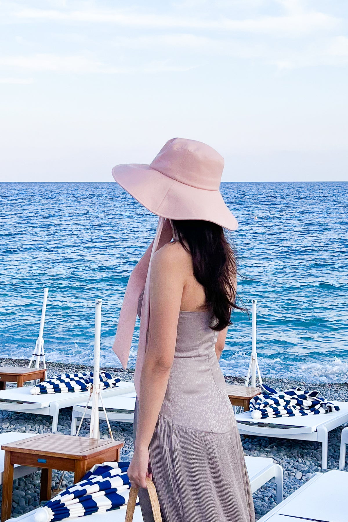 Crafted from a sensual blend of cotton and silk, Sabbia hat whispers of summer freedom. Inspired by the rolling dunes, its crown is a soft, breathable haven for your head. Statement ties lay playfully beneath your chin, while the fabric's natural sheen evokes the sun-kissed glow of endless summer days.